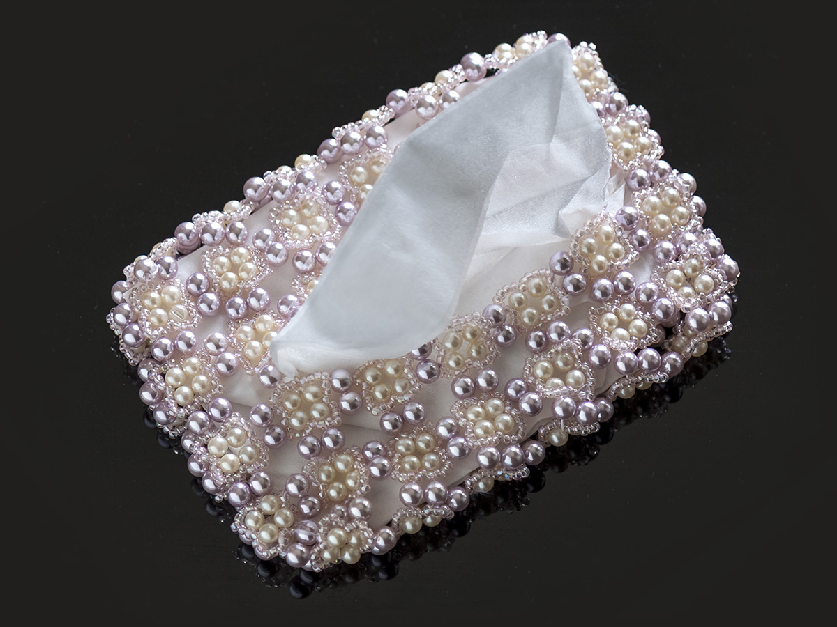 淡いピンク・ホワイトのパール等で編んだポケットティッシュカバー。いつも持ち歩くポケットティッシュをお洒落に変身させちゃいます。ちょっとしたお出かけなどにぴったりの清楚で大人可愛いキラキラのお洒落アイテムです。長辺約11cm×短辺約8cm